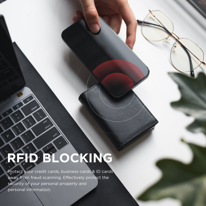 Our smart wallet has a space-grade 6061-T6 aluminum backplate which blocks RFID. The wallet itself is also made of genuine leather and is fixed with neat stitching.
